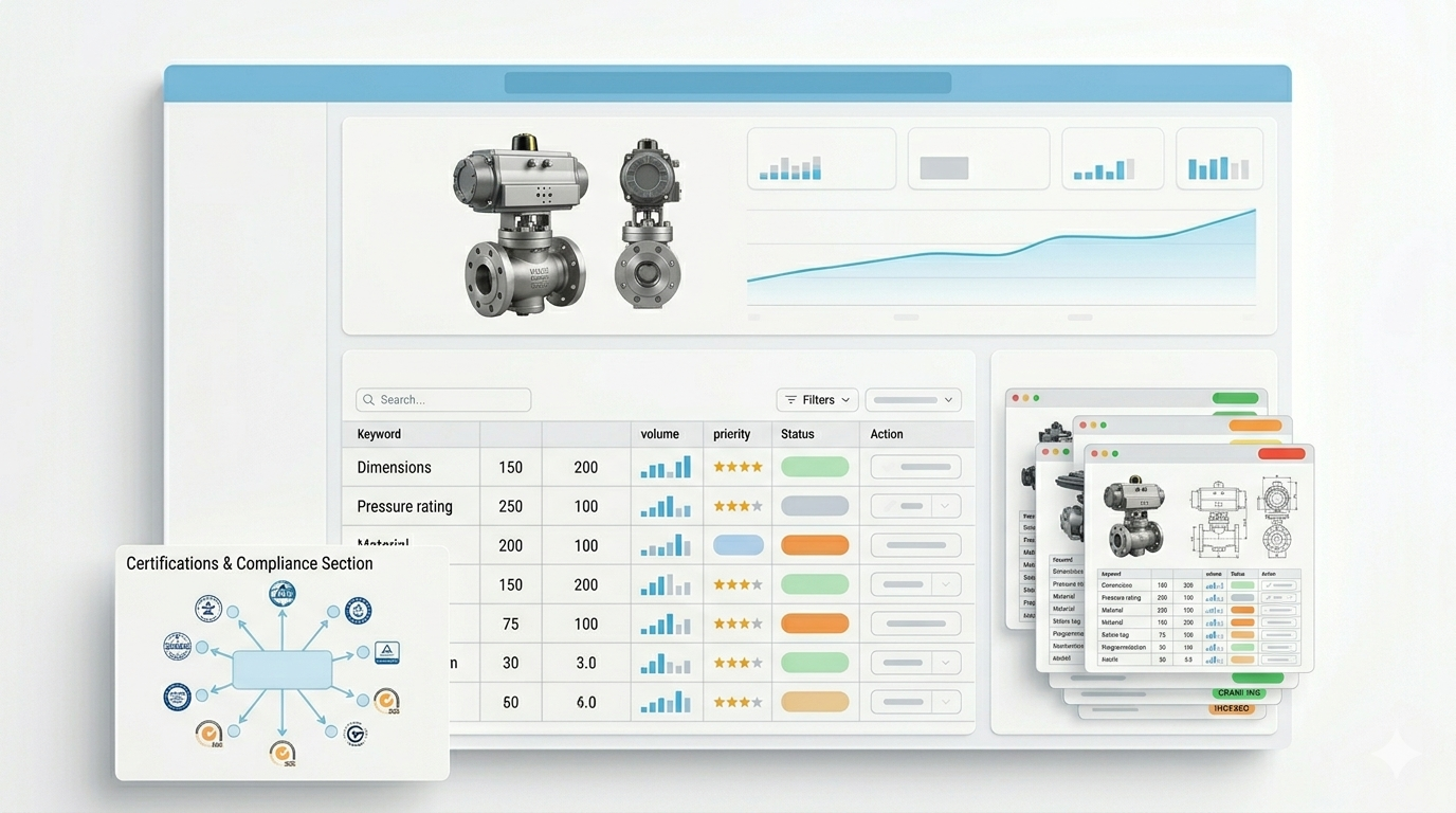 We map every high-intent keyword in your market — product names, specifications, compliance terms, and location combinations. The output is a structured keyword database you own, built specifically around how your buyers search.